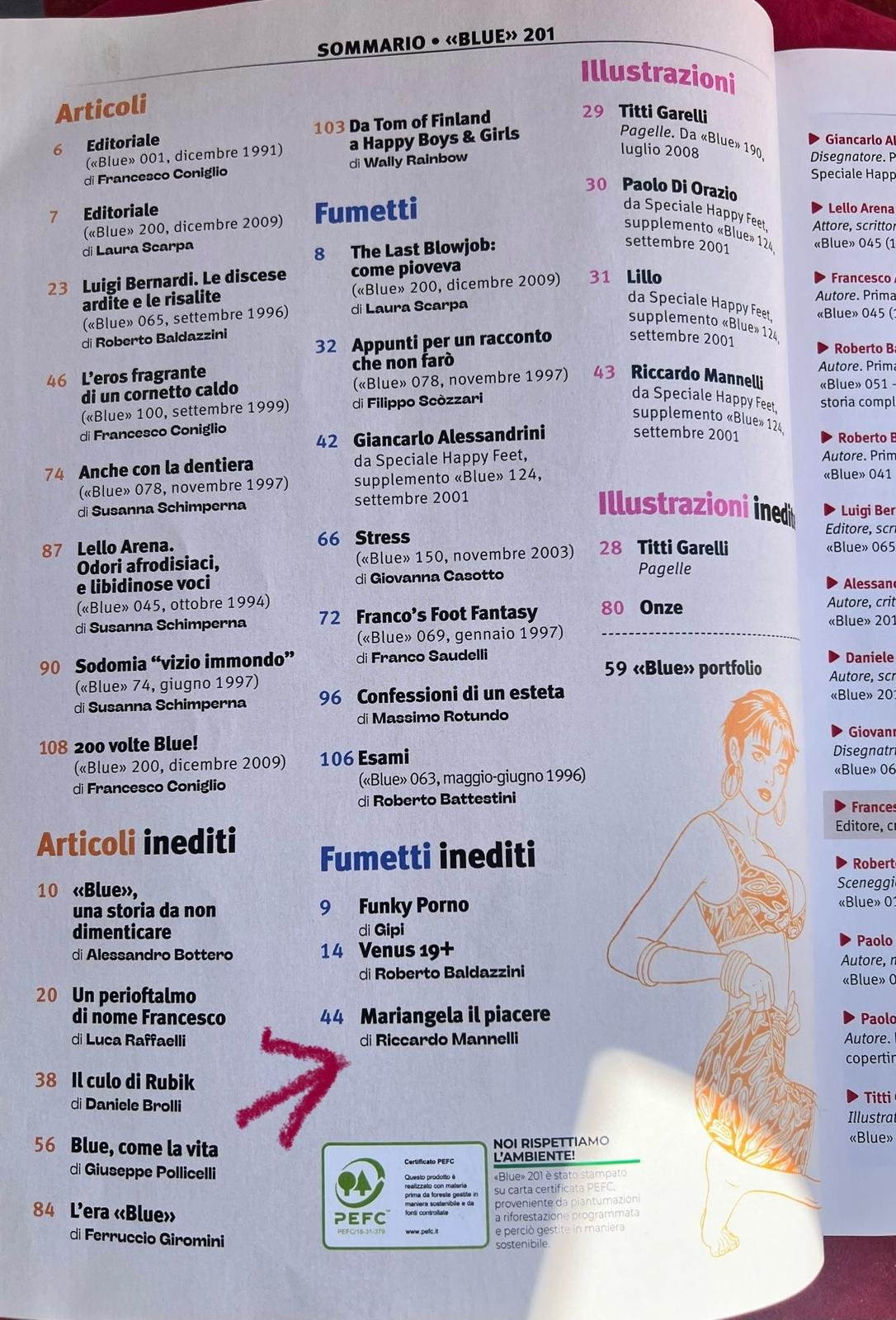 Pubblicazione speciale della rivista Blue, edita nel 2023, con numerazione #201 come omaggio al direttore Francesco Coniglio nell'ambito del progetto "Mariangela. Il Piacere" di Riccardo Mannelli e Mariangela Imbrenda
